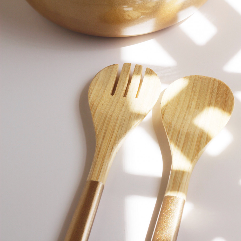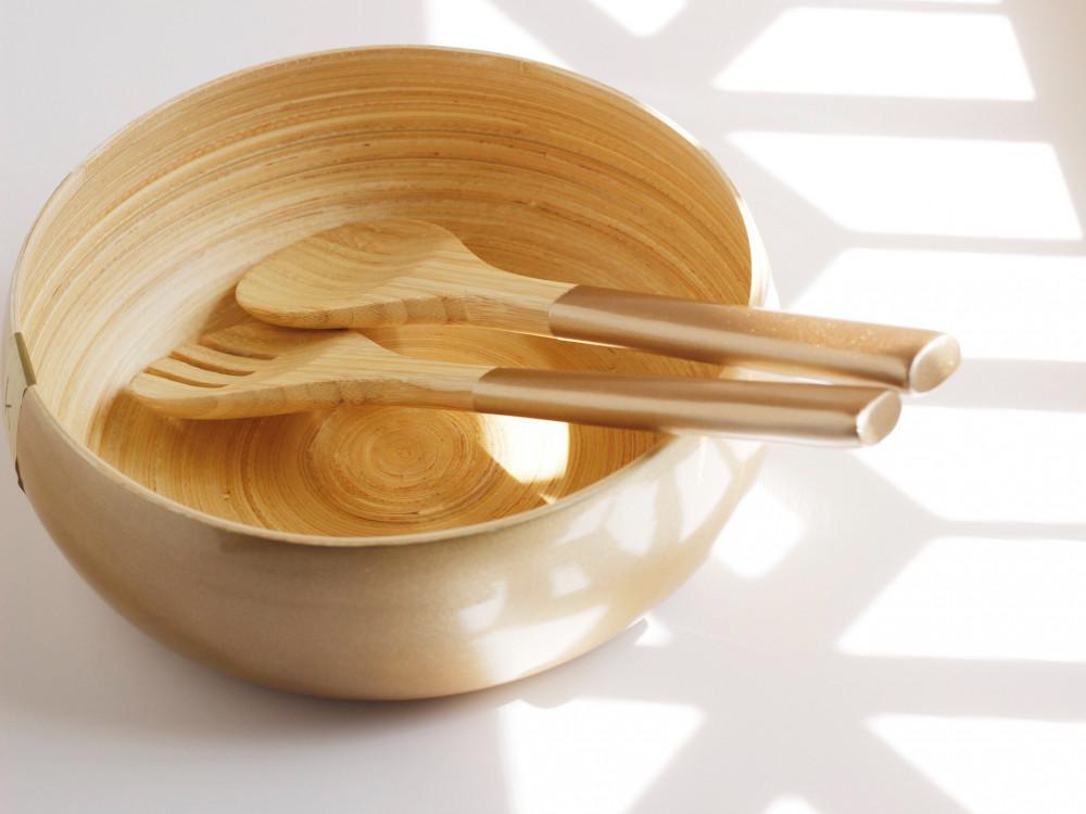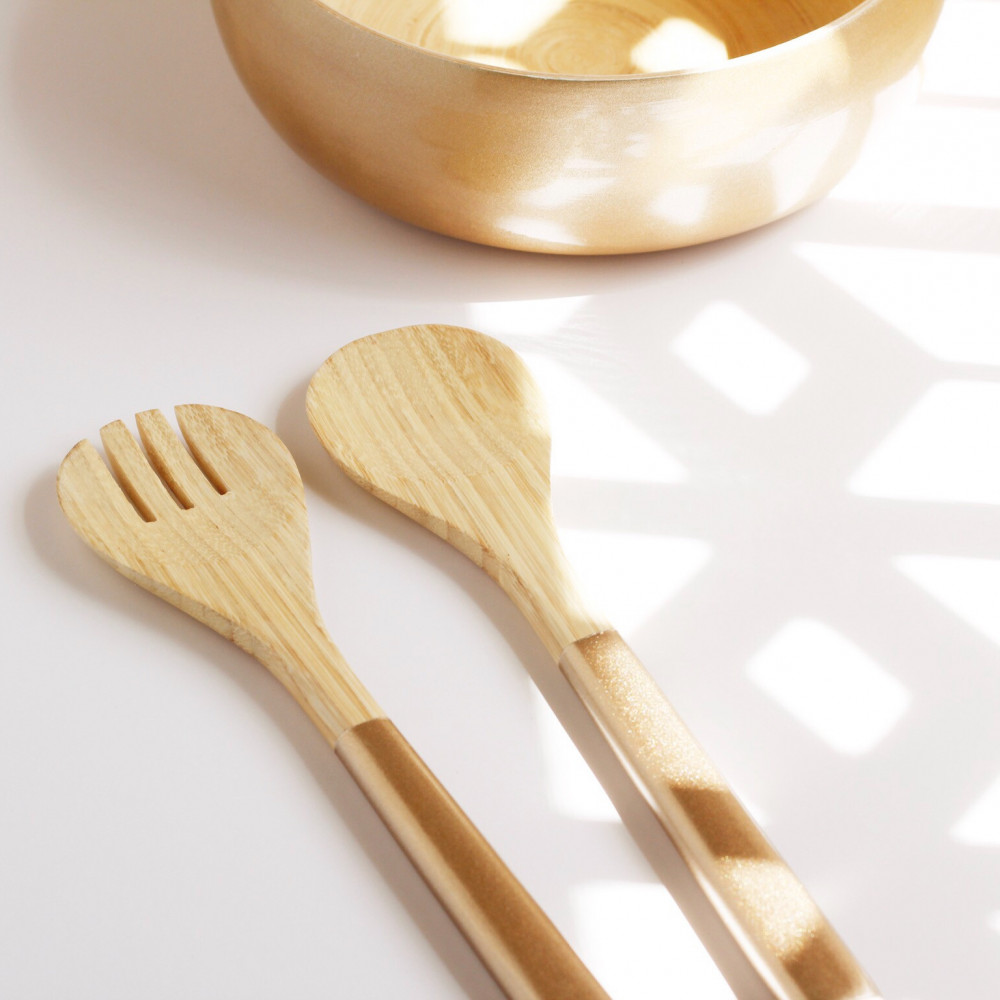 تتميز هذه المجموعه بمقابض ذهبية اللون مما تخلق تبايناً معدنياً مع الخيزران ذي اللون الفاتح.