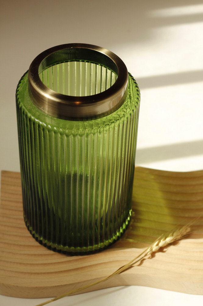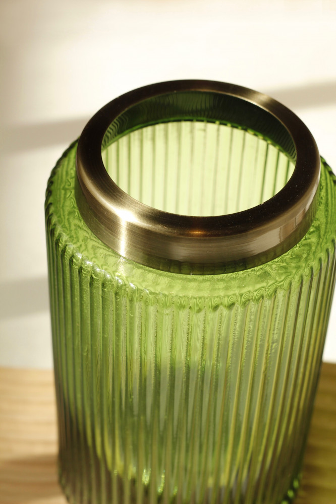 مزهرية زجاجية رقيقة بلون أخضر وفوهة معدنية بلون ذهبي