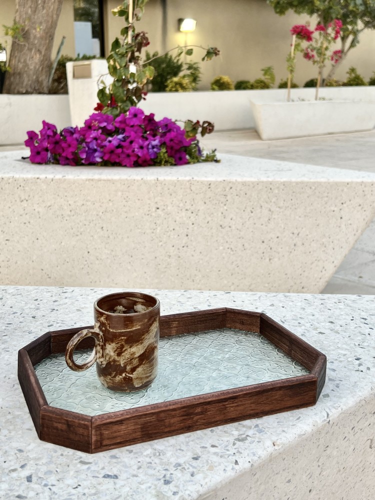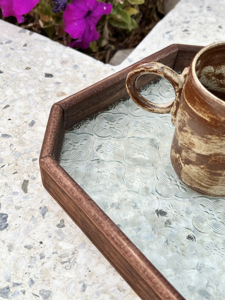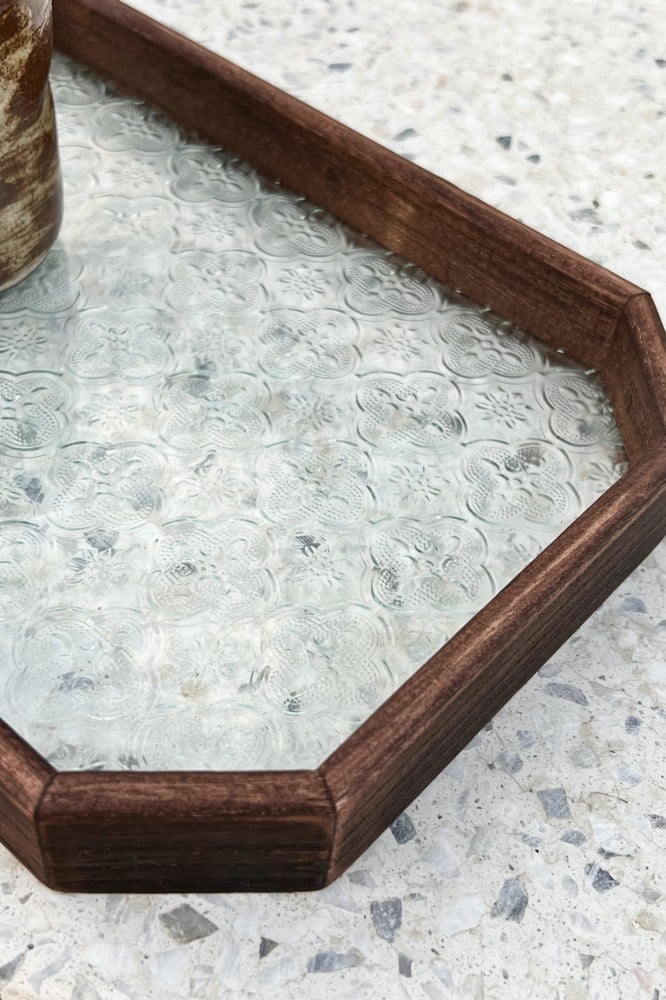 صينية تقديم بقاعدة زجاج وحواف خشبية